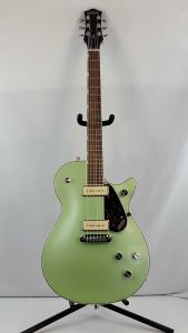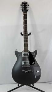 The G2622 Streamliner(TM) Center Block Double-Cut with V-Stoptail combines vintage Gretsch style with modern performance and power. It features a Broad'Tron(TM) BT-2S humbucking pickup and a lightweight spruce center block, delivering a tight, defined sound with robust lows, pristine highs, and a throaty midrange. The traditional control layout includes neck and bridge pickup volume controls, a master tone control, master volume control, and three-way pickup switching. The fast-playing 12-radius laurel fingerboard has pearloid Big Block inlays and a thin U-shaped neck profile. Other features include a Gretsch V-Stoptail tailpiece, anchored Adjusto-Matic(TM) bridge, synthetic bone nut, vintage-style black control knobs, enlarged F-holes, aged white binding with upgraded purfling, nickel hardware, tortoise pickguard, and arched laminated maple construction. With its classic style and updated sound, the G2622 is a must-have for guitarists who demand performance, style, and volume from their instruments.